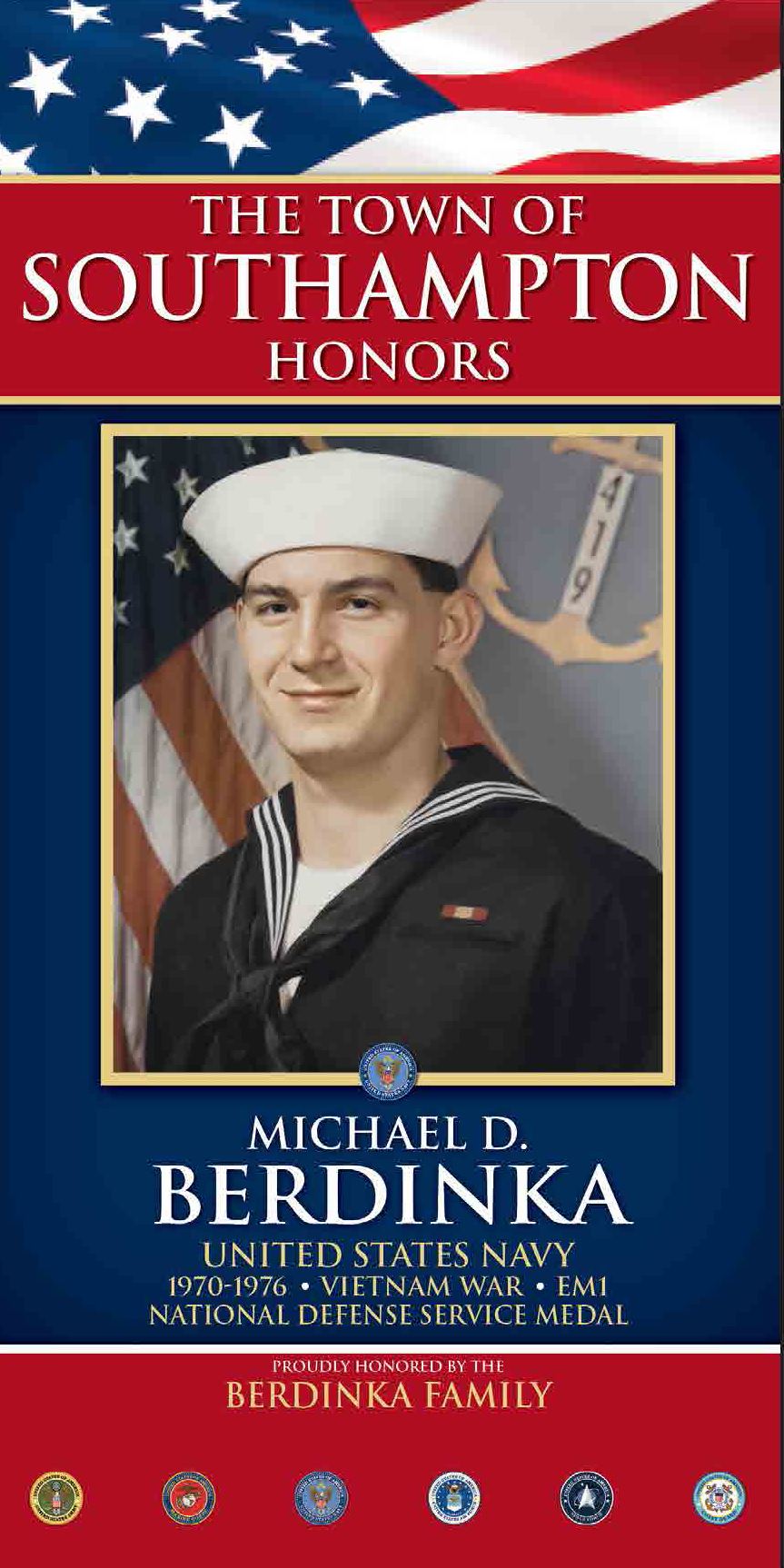 Michael Berdinka grew up in Westhampton. After graduating from Westhampton Beach High School, he attended SUNY Cobleskill, where he received an associate’s degree in accounting. However, he realized that accounting wasn’t for him. As a child, Berdinka became interested in submarines, and after graduating from Cobleskill, he decided to enlist in the Navy. He volunteered for a detail on nuclear submarines and was admitted into the Navy’s nuclear program. He trained first in electrical at the USO of Illinois Great Lakes training center, and then was stationed aboard the submarine tender USS Howard W. Gilmore. He then attended Nuclear power school to train as a nuclear reactor operator. He subsequently served aboard the USS Sargo (SSN-583), a nuclear fast attack submarine. During that time, he participated in weekly operations around Pearl Harbor and underwent training in individual submarine escape, controllers and circuit breakers, and submarine damage control, where he was trained to stop flooding inside a sub. Berdinka was then deployed to the Western Pacific where he toured Guam, the Philippines, Korea and Hong Kong. When he was honorably discharged from the Navy, he was an Electrician’s Mate First Class.