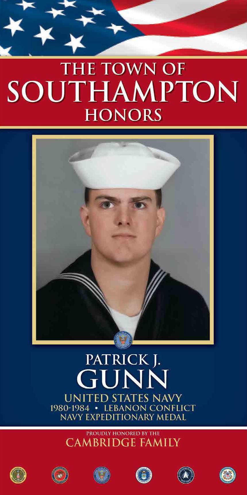 Patrick Gunn grew up in Queens Village, New York. He enlisted in the United States Navy shortly after high school and was assigned as an Operations Specialist to the Norfolk-based guided missile destroyer U.S.S. Farragut (DDG-37) which served as part of the U.S. Sixth Fleet in the Mediterranean Sea during the Lebanon Conflict from 1982-1983. He received the Navy Expeditionary Medal, Sea Service Ribbon, and Commander Sixth Fleet Commendation. Patrick was honorably discharged from the United States Navy in 1984 at the rank of Petty Officer Second Class (E-5).