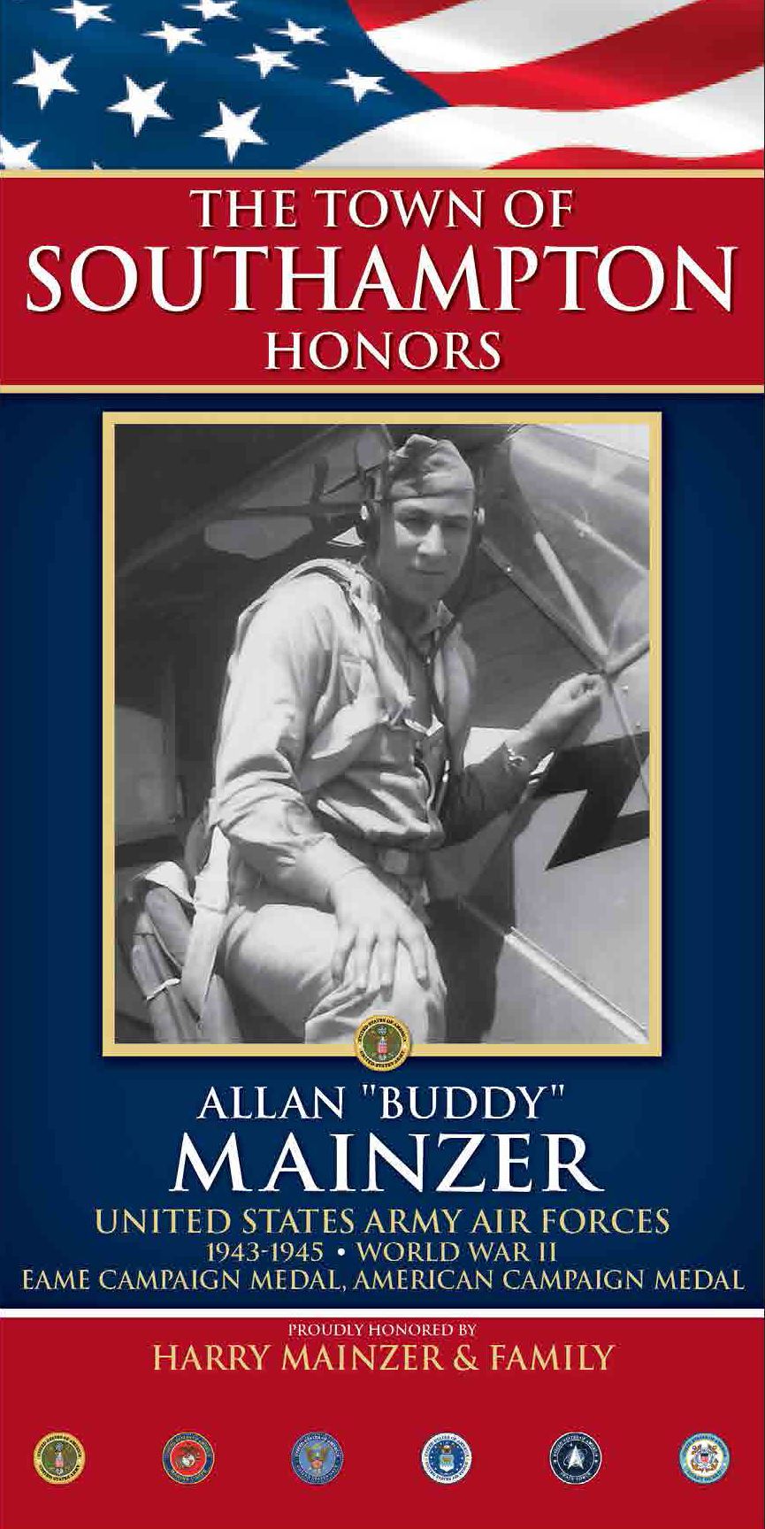 Allan Mainzer, known as “Buddy” since childhood, was born and raised in Quogue Village.  He graduated from Quogue Elementary School and Westhampton Beach HS.  As a 17-year-old senior in high school, Buddy enlisted in the Army Air Corps.  He was sworn in after graduation and spent the next year plus training at various bases in the U.S.  After being assigned to a B-24 bomber crew as a Radio Operator/Waist Gunner, Buddy and his crewmates flew to their European base in Venosa, Italy.  In Venosa, they became part of the 829th Bombardment Squadron of the 485th Bombardment Group (Heavy).