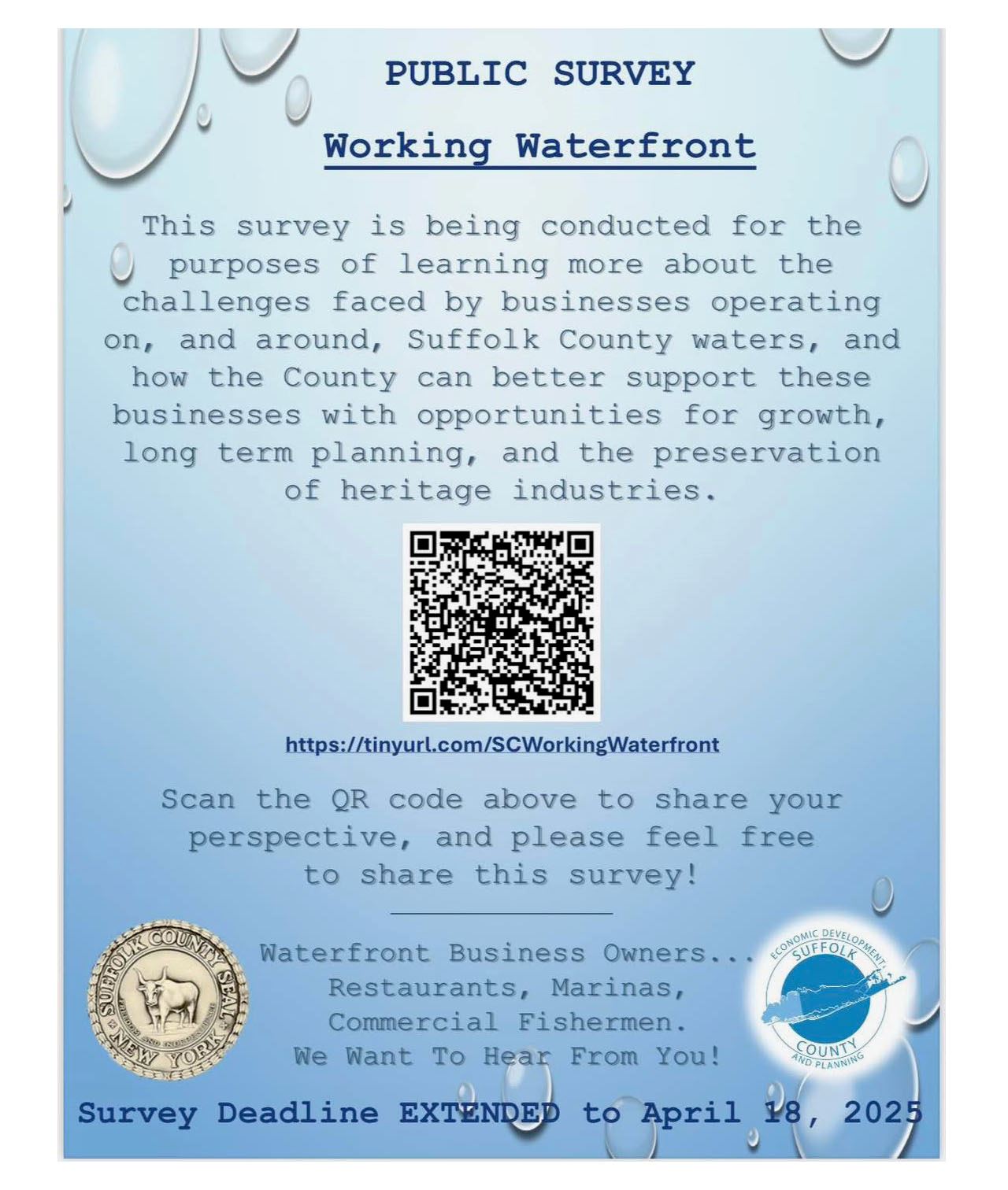 This survey is being conducted for the purposes of learning more about the challenges faced by businesses operating on, and around, Suffolk County waters, and how the County can better support these businesses with opportunities for growth, long term planning, and the preservation of heritage industries.