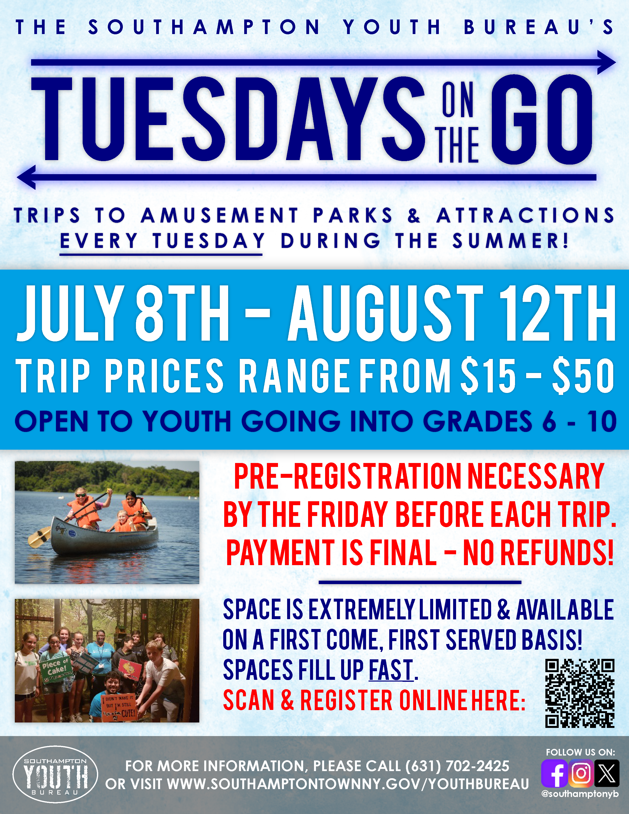 The Youth Bureau will sponsor supervised trips to local amusement parks & attractions on Tuesdays during the summer starting July 8 until August 12 for grades 6 – 10 (Bus to/from Flanders Community Center). Trip prices range from $15 - $50.